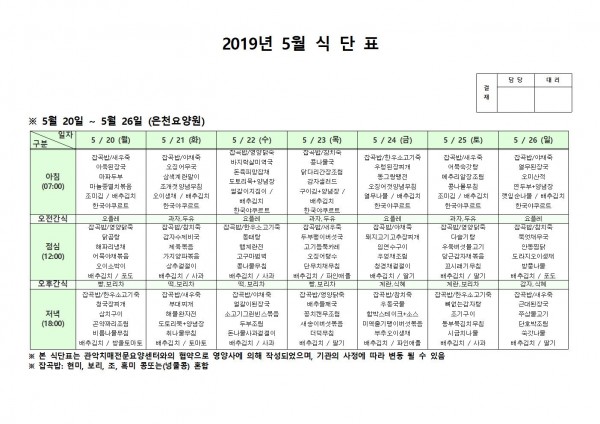 5월 셋째주 식단표 페이지 정보 작성자 은천노인복지회 작성일19-05-27 14:07 조회203,310회 댓글0건 관련링크 이전글 다음글 목록 답변 본문 5월 셋째주 식단표 이전글 다음글 목록 답변