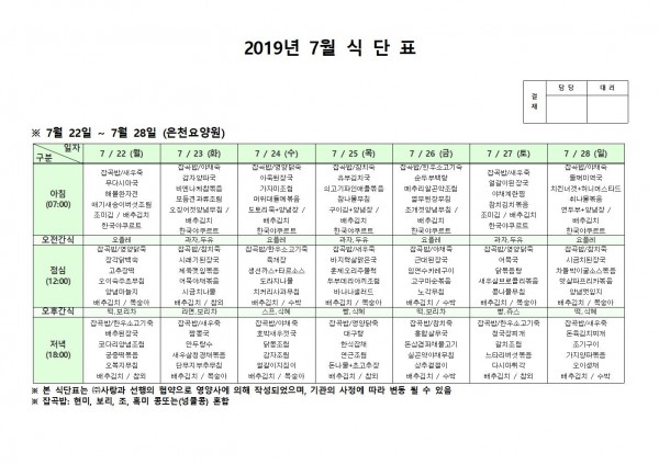 7월 넷째주 식단표 페이지 정보 작성자 은천노인복지회 작성일19-07-29 13:58 조회198,650회 댓글0건 관련링크 이전글 다음글 목록 답변 본문 7월 넷째주 식단표 이전글 다음글 목록 답변
