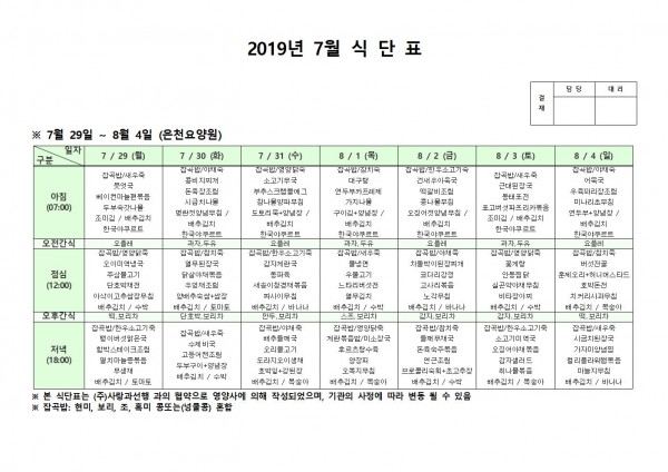 8월 첫째주 식단표 페이지 정보 작성자 은천노인복지회 작성일19-08-05 13:41 조회198,476회 댓글0건 관련링크 이전글 다음글 목록 답변 본문 8월 첫째주 식단표 이전글 다음글 목록 답변