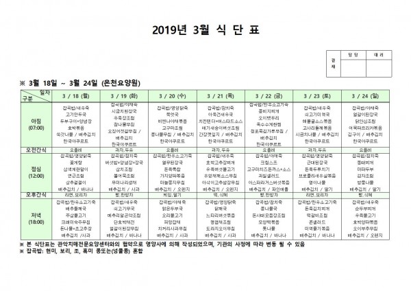 3월 셋째주 식단표 페이지 정보 작성자 은천노인복지회 작성일19-03-25 11:11 조회205,943회 댓글0건 관련링크 이전글 다음글 목록 답변 본문 3월 셋째주 식단표 이전글 다음글 목록 답변