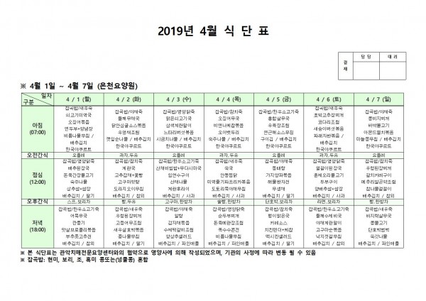 4월 첫째주 식단표 페이지 정보 작성자 은천노인복지회 작성일19-04-08 11:56 조회206,574회 댓글0건 관련링크 이전글 다음글 목록 답변 본문 4월 첫째주 식단표 이전글 다음글 목록 답변