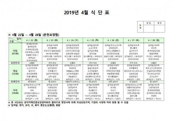 4월 넷째주 식단표 페이지 정보 작성자 은천노인복지회 작성일19-04-29 10:14 조회206,674회 댓글0건 관련링크 이전글 다음글 목록 답변 본문 4월 넷째주 식단표 이전글 다음글 목록 답변