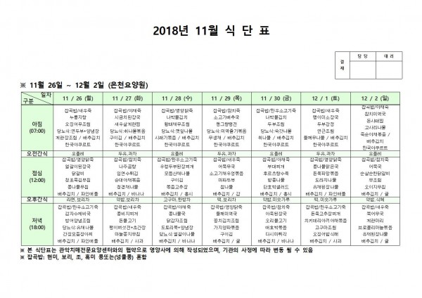 11월 4주째 식단표 페이지 정보 작성자 은천노인복지회 작성일18-12-07 09:38 조회210,418회 댓글0건 관련링크 이전글 다음글 목록 답변 본문 11월 4주째 식단표 이전글 다음글 목록 답변
