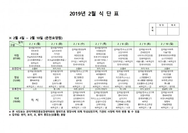 2월 첫째주 식단표 페이지 정보 작성자 은천노인복지회 작성일19-02-13 17:29 조회207,552회 댓글0건 관련링크 이전글 다음글 목록 답변 본문 2월 첫째주 식단표 이전글 다음글 목록 답변