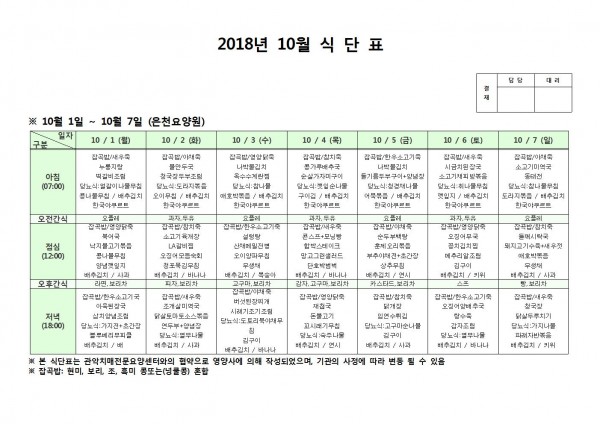 10월 첫째주 식단표 페이지 정보 작성자 은천노인복지회 작성일18-10-08 11:06 조회205,858회 댓글0건 관련링크 이전글 다음글 목록 답변 본문 10월 첫째주 식단표 이전글 다음글 목록 답변