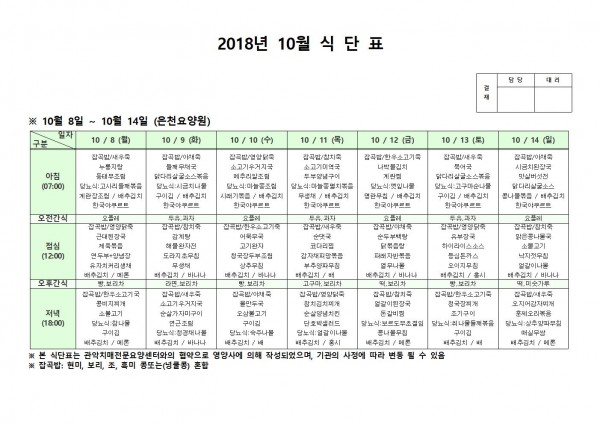 10월 둘째주 식단표 페이지 정보 작성자 은천노인복지회 작성일18-10-19 13:45 조회205,853회 댓글0건 관련링크 이전글 다음글 목록 답변 본문 10월 둘째주 식단표 이전글 다음글 목록 답변