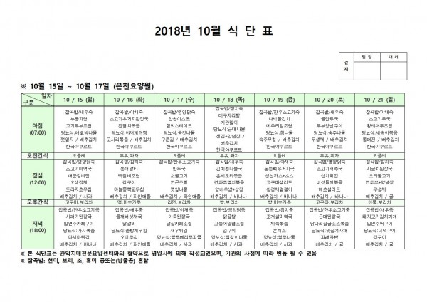 10월 셋째주 식단표 페이지 정보 작성자 은천노인복지회 작성일18-10-30 09:48 조회206,602회 댓글0건 관련링크 이전글 다음글 목록 답변 본문 10월 셋째주 식단표 이전글 다음글 목록 답변