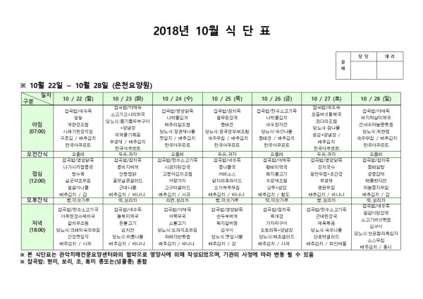10월 넷째주 식단표 페이지 정보 작성자 은천노인복지회 작성일18-10-30 09:49 조회207,408회 댓글0건 관련링크 이전글 다음글 목록 답변 본문 10월 넷째주 식단표 이전글 다음글 목록 답변
