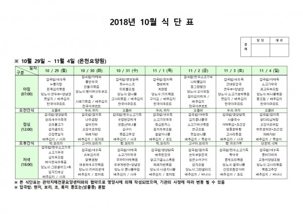 10월 5주째 식단표 페이지 정보 작성자 은천노인복지회 작성일18-12-07 09:36 조회208,094회 댓글0건 관련링크 이전글 다음글 목록 답변 본문 10월 5주째 식단표 이전글 다음글 목록 답변