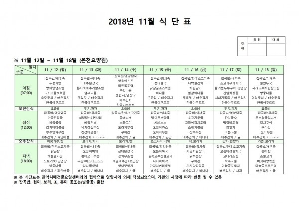 11월 2주째 식단표 페이지 정보 작성자 은천노인복지회 작성일18-12-07 09:37 조회208,586회 댓글0건 관련링크 이전글 다음글 목록 답변 본문 11월 2주째 식단표 이전글 다음글 목록 답변