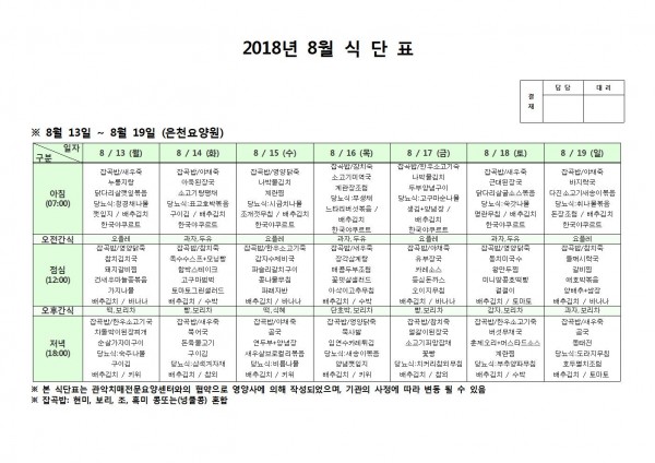8월 셋째주 식단표 페이지 정보 작성자 은천노인복지회 작성일18-08-27 09:47 조회207,911회 댓글0건 관련링크 이전글 다음글 목록 답변 본문 8월 셋째주 식단표 이전글 다음글 목록 답변