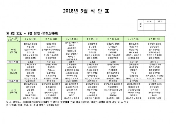 3월 셋째주 식단표 페이지 정보 작성자 은천노인복지회 작성일18-03-12 10:41 조회200,224회 댓글0건 관련링크 이전글 다음글 목록 답변 본문 3월 셋째주 식단표 이전글 다음글 목록 답변