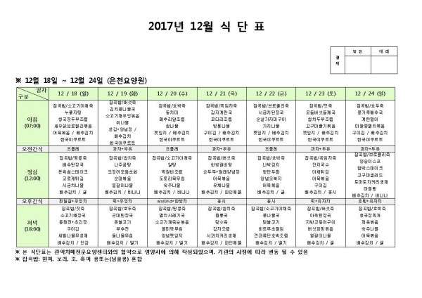 12월 넷째주 식단표 페이지 정보 작성자 은천노인복지회 작성일17-12-18 16:58 조회192,642회 댓글0건 관련링크 이전글 다음글 목록 답변 본문 12월 넷째주 식단표 이전글 다음글 목록 답변