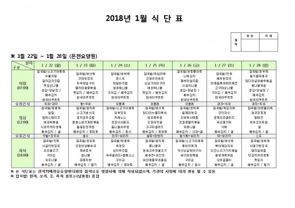 1월 넷째주 식단표 페이지 정보 작성자 은천노인복지회 작성일18-01-24 11:07 조회196,466회 댓글0건 관련링크 이전글 다음글 목록 답변 본문 1월 넷째주 식단표 이전글 다음글 목록 답변