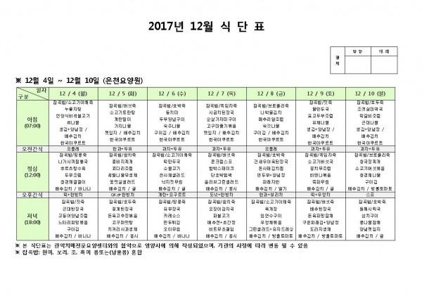12월 둘째주 식단표 페이지 정보 작성자 은천노인복지회 작성일17-12-04 13:47 조회190,481회 댓글0건 관련링크 이전글 다음글 목록 답변 본문 12월 둘째주 식단표 이전글 다음글 목록 답변