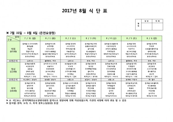 8월 첫째주 식단표 페이지 정보 작성자 은천노인복지회 작성일17-08-01 13:43 조회182,848회 댓글0건 관련링크 이전글 다음글 목록 답변 본문 8월 첫째주 식단표 이전글 다음글 목록 답변