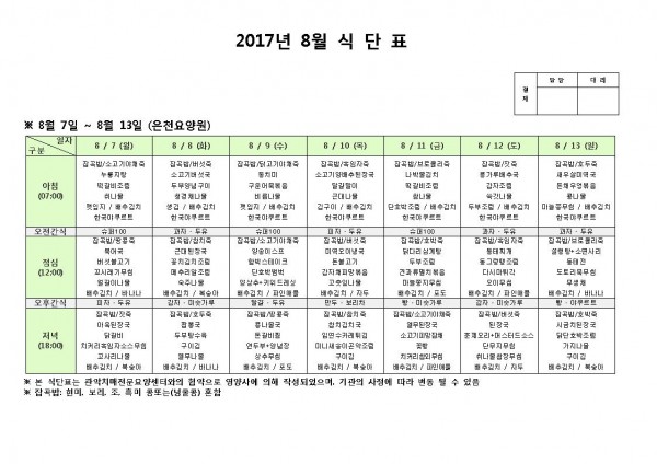 8월 둘째주 식단표 페이지 정보 작성자 은천노인복지회 작성일17-08-07 09:46 조회182,920회 댓글0건 관련링크 이전글 다음글 목록 답변 본문 8월 둘째주 식단표 이전글 다음글 목록 답변
