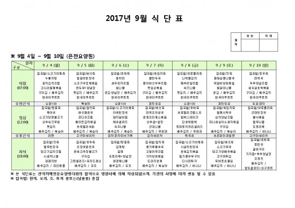 9월 첫째주 식단표 페이지 정보 작성자 은천노인복지회 작성일17-09-04 15:14 조회183,834회 댓글0건 관련링크 이전글 다음글 목록 답변 본문 9월 첫째주 식단표 이전글 다음글 목록 답변