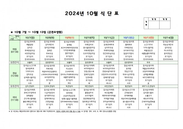 10월 둘째주 식단표 페이지 정보 작성자 은천노인복지회 작성일24-10-04 11:48 조회22,627회 댓글0건 관련링크 이전글 다음글 목록 답변 본문 . 이전글 다음글 목록 답변