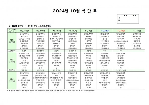 10월 다섯째 주 식단표 페이지 정보 작성자 은천노인복지회 작성일24-10-24 15:18 조회21,868회 댓글0건 관련링크 이전글 다음글 목록 답변 본문 . 이전글 다음글 목록 답변