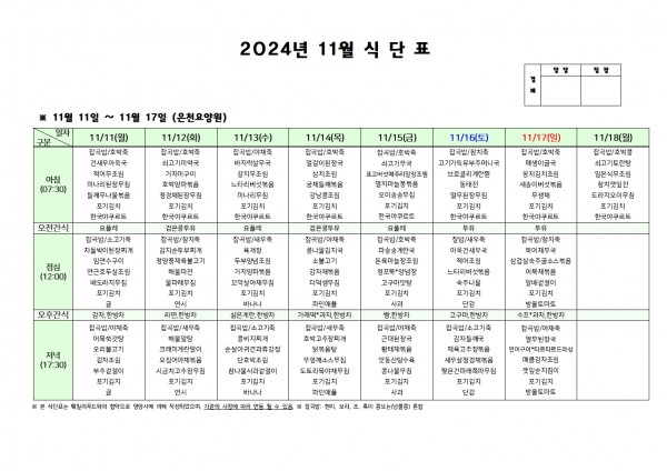 11월 둘째주 식단표 페이지 정보 작성자 은천노인복지회 작성일24-11-07 16:50 조회21,803회 댓글0건 관련링크 이전글 다음글 목록 답변 본문 . 이전글 다음글 목록 답변