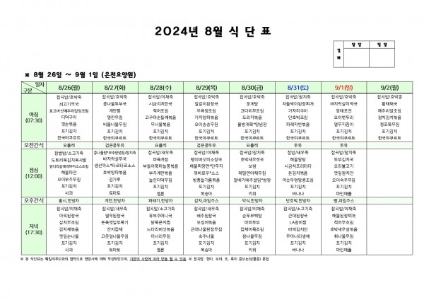 8월 다섯째주 식단표 페이지 정보 작성자 은천노인복지회 작성일24-08-23 11:34 조회24,601회 댓글0건 관련링크 이전글 다음글 목록 답변 본문 . 이전글 다음글 목록 답변