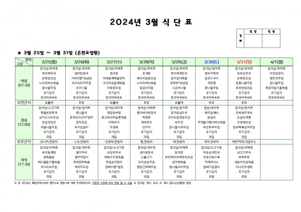 3월 다섯째주 식단표 페이지 정보 작성자 은천노인복지회 작성일24-03-22 10:02 조회30,160회 댓글0건 관련링크 이전글 다음글 목록 답변 본문 . 이전글 다음글 목록 답변