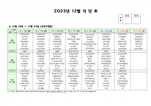 12월 넷째주 식단표 페이지 정보 작성자 은천노인복지회 작성일23-12-15 11:21 조회36,972회 댓글0건 관련링크 이전글 다음글 목록 답변 본문 . 이전글 다음글 목록 답변