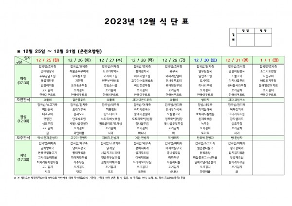 12월 다섯째주 식단표 페이지 정보 작성자 은천노인복지회 작성일23-12-22 15:50 조회35,950회 댓글0건 관련링크 이전글 다음글 목록 답변 본문 . 이전글 다음글 목록 답변