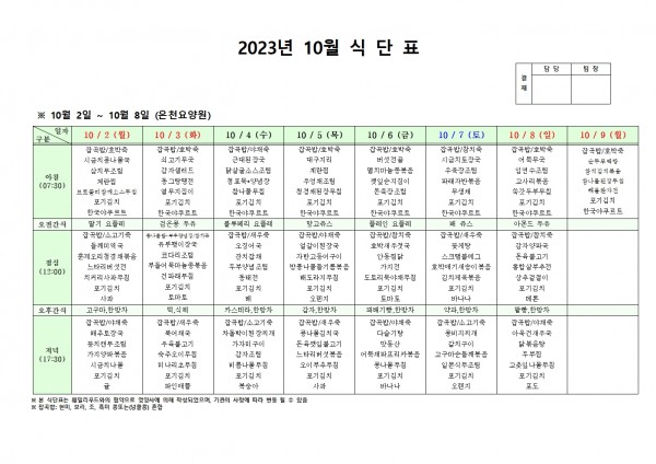 10월 첫째주 식단표 페이지 정보 작성자 은천노인복지회 작성일23-10-05 17:41 조회40,487회 댓글0건 관련링크 이전글 다음글 목록 답변 본문 . 이전글 다음글 목록 답변