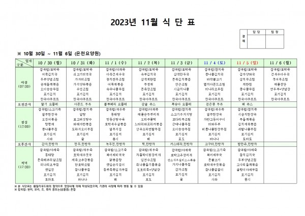 11월 첫째주 식단표 페이지 정보 작성자 은천노인복지회 작성일23-10-26 13:39 조회38,890회 댓글0건 관련링크 이전글 다음글 목록 답변 본문 . 이전글 다음글 목록 답변