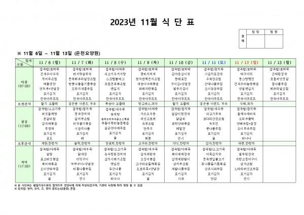 11월 둘째주 식단표 페이지 정보 작성자 은천노인복지회 작성일23-11-02 17:19 조회39,152회 댓글0건 관련링크 이전글 다음글 목록 답변 본문 . 이전글 다음글 목록 답변