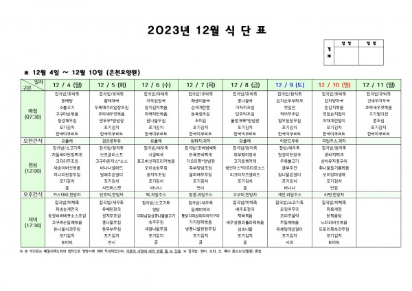 12월 둘째주 식단표 페이지 정보 작성자 은천노인복지회 작성일23-12-01 16:35 조회35,007회 댓글0건 관련링크 이전글 다음글 목록 답변 본문 . 이전글 다음글 목록 답변