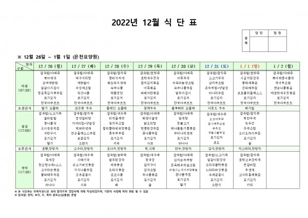 12월 넷째주 식단표 페이지 정보 작성자 은천노인복지회 작성일22-12-26 14:01 조회87,891회 댓글0건 관련링크 이전글 다음글 목록 답변 본문 . 이전글 다음글 목록 답변