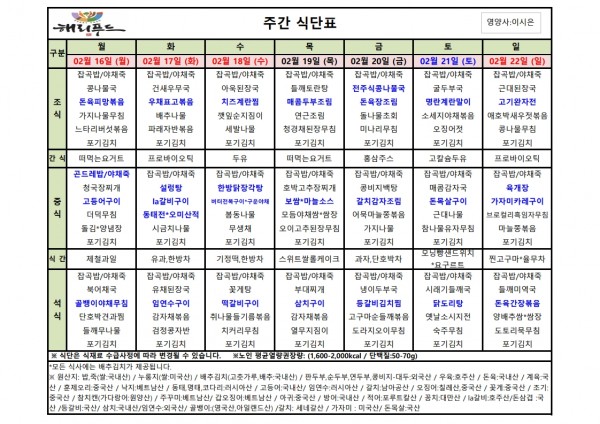 2월 셋째주 식단표 페이지 정보 작성자 은천노인복지회 작성일26-02-12 17:43 조회3,647회 댓글0건 관련링크 이전글 다음글 목록 답변 본문 2월 셋째주 어르신 식단표 안내해 드립니다. 정성과 영양을 담아 준비하겠습니다. 이전글 다음글 목록 답변