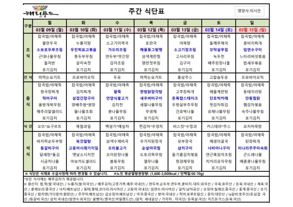 3월 둘째주 식단표 페이지 정보 작성자 은천노인복지회 작성일26-03-06 15:04 조회2,192회 댓글0건 관련링크 이전글 다음글 목록 답변 본문 3월 둘째주 어르신 식단표 안내해 드립니다. 정성과 영양을 담아 준비하겠습니다. 이전글 다음글 목록 답변