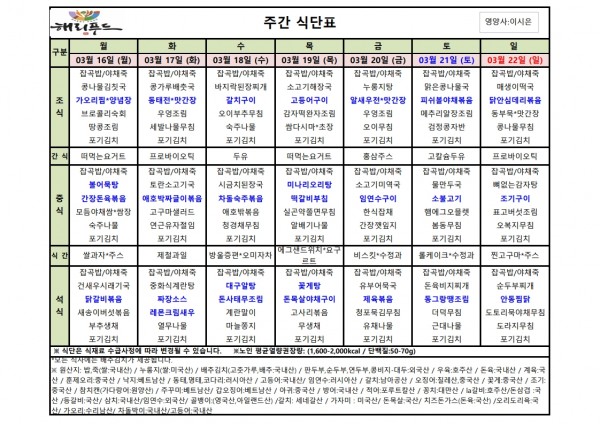 3월 셋째주 식단표 페이지 정보 작성자 은천노인복지회 작성일26-03-13 15:20 조회2,027회 댓글0건 관련링크 이전글 다음글 목록 답변 본문 3월 셋째주 어르신 식단표 안내해 드립니다. 정성과 영양을 담아 준비하겠습니다. 이전글 다음글 목록 답변