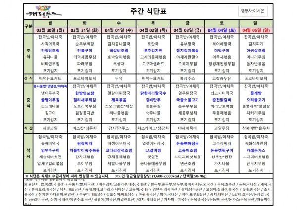 3월 다섯째주 식단표 페이지 정보 작성자 은천노인복지회 작성일26-03-26 17:49 조회585회 댓글0건 관련링크 이전글 다음글 목록 답변 본문 3월 다섯째주 어르신 식단표 안내해 드립니다. 정성과 영양을 담아 준비하겠습니다. 이전글 다음글 목록 답변