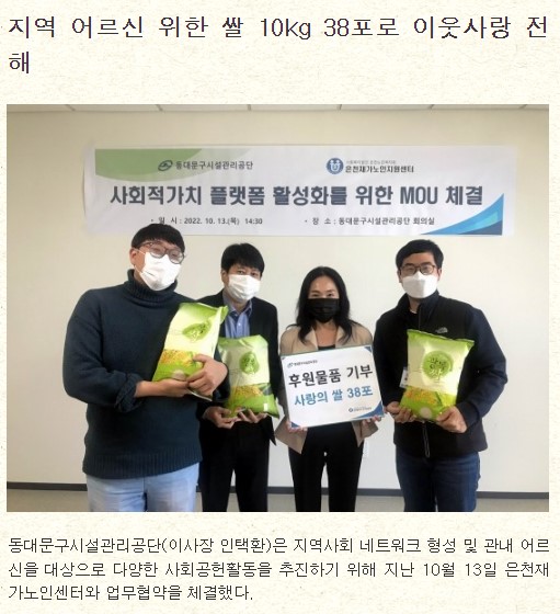 은천재가노인지원센터와 시설관리공단의 협약체결 페이지 정보 작성자 은천노인복지회 작성일22-11-09 16:58 조회8,783회 댓글0건 관련링크 https://blog.naver.com/news500/222901633880 4665회 연결 목록 답변 본문 동대문시설관리공단과 은천재가노인지원센터와 협약을 체결하였습니다앞으로 상호 협조하여 어르신의 행복한 노후를 위하여 계속 노력하겠습니다. 목록 답변
