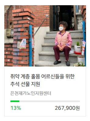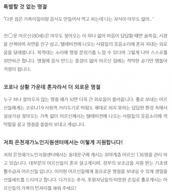 취약계층 어르신을 위한 추석선물 모금활동 페이지 정보 작성자 은천노인복지회 작성일21-08-23 10:22 조회30,138회 댓글0건 관련링크 https://happybean.naver.com/donations/H000000178857 22049회 연결 목록 본문 취약계층 어르신의 추석선물 지원을 위해 해피빈에서 모금활동을 하고 있습니다~ 모금활동에 많은 동참을 부탁드립니다~ 목록