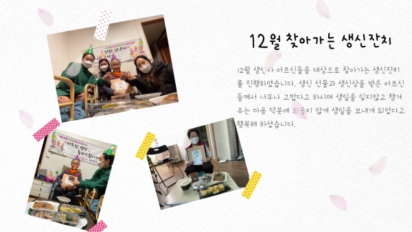 [재가노인지원서비스 ] 12월 찾아가는 생신잔치 페이지 정보 작성자 은천노인복지회 작성일21-12-31 13:32 조회20,576회 댓글0건 관련링크 이전글 다음글 목록 답변 본문 12월 찾아가는 생신잔치 이전글 다음글 목록 답변