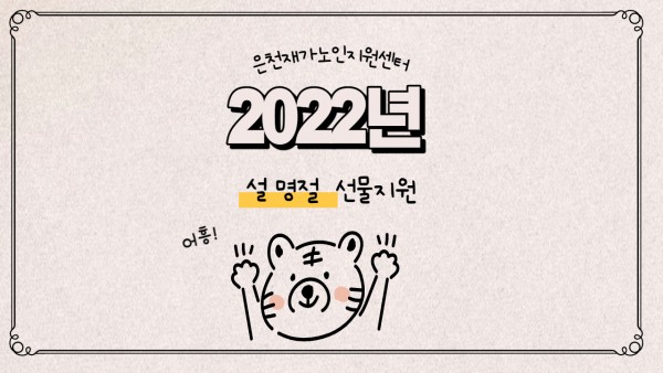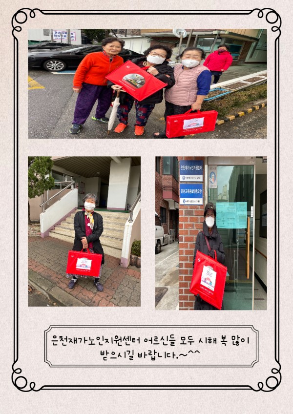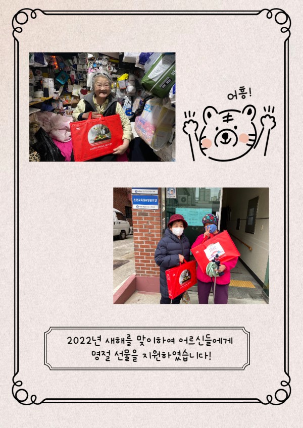 [재가노인지원서비스] 2022년 명절(설) 선물지원 페이지 정보 작성자 은천노인복지회 작성일22-02-07 15:21 조회19,985회 댓글0건 관련링크 이전글 다음글 목록 답변 본문 2022년 새해를 맞이하여 어르신들에게 선물을 지원하였습니다. 이전글 다음글 목록 답변