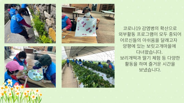 [재가노인지원] 봄 나들이 페이지 정보 작성자 은천노인복지회 작성일22-06-03 17:15 조회18,861회 댓글0건 관련링크 이전글 다음글 목록 답변 본문 재가노인지원센터 어르신들과 양평 보릿고개마을로 나들이를 다녀왔습니다. 이전글 다음글 목록 답변