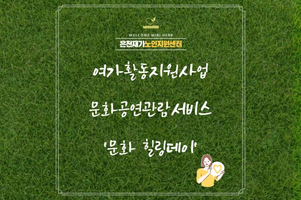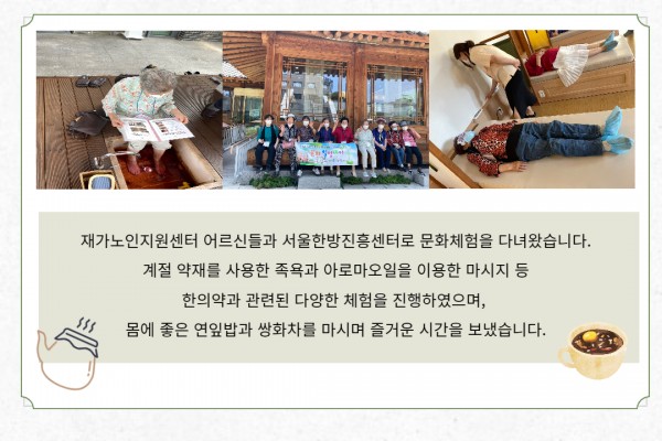 [재가노인지원] 문화공연관람서비스 '문화 힐링데이' 페이지 정보 작성자 은천노인복지회 작성일22-06-03 17:19 조회18,532회 댓글0건 관련링크 이전글 다음글 목록 답변 본문 2022년 상반기 문화활동으로 서울한방진흥센터에 다녀왔습니다. 이전글 다음글 목록 답변